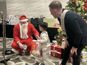 会場がさらに盛り上がってきたところで、恒例のサンタクロースが登場!子どもたちはサンタからたくさんのプレゼントを嬉しそうに受け取っていました。